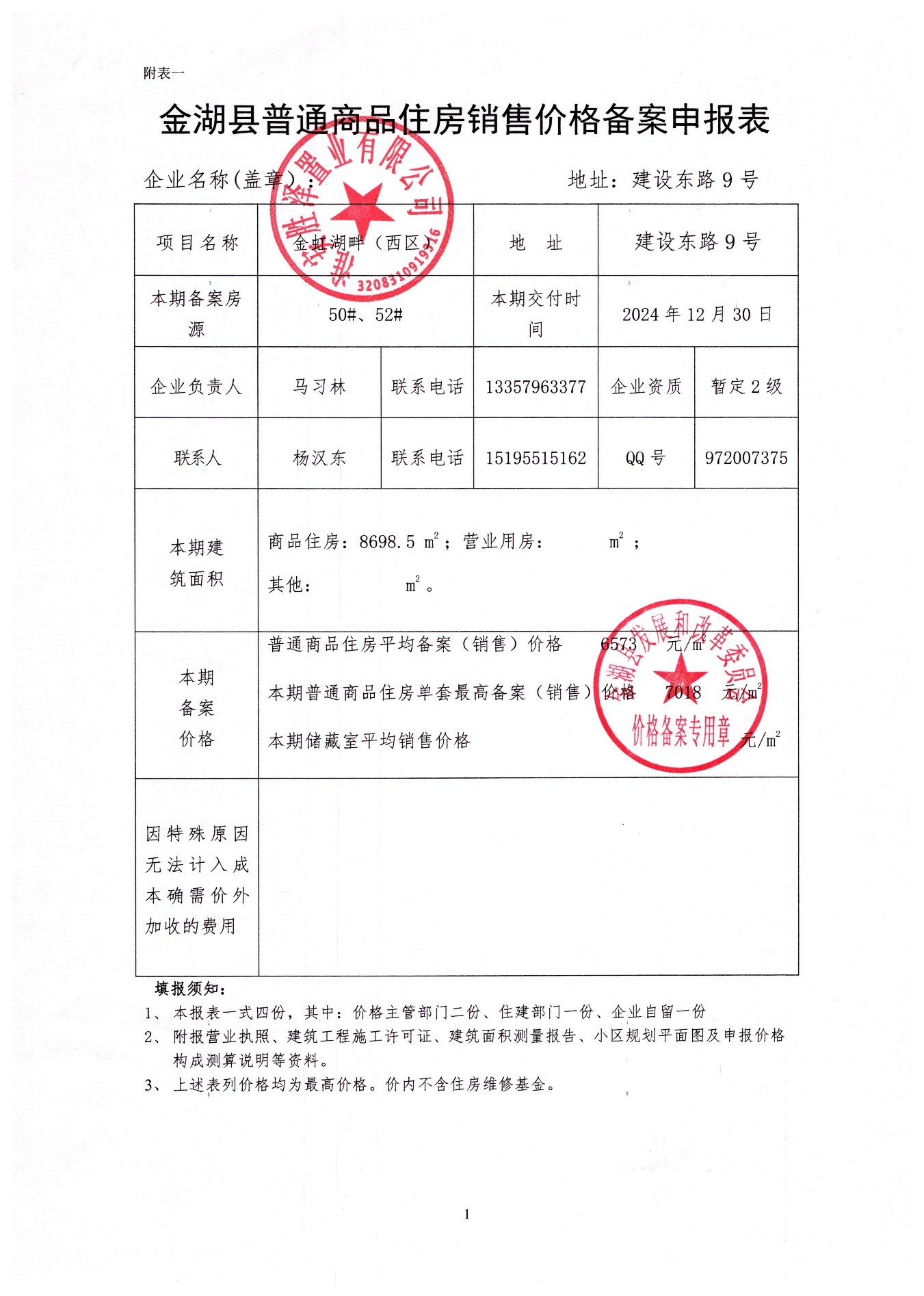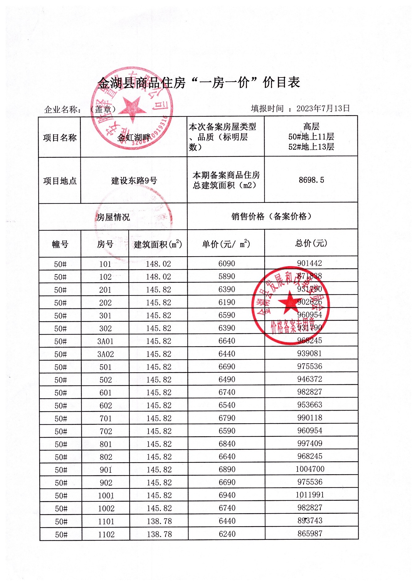 金虹湖畔(50#、52#)楼盘备案价格的公示
